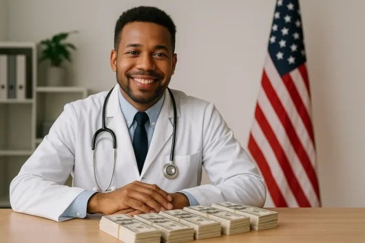 میانگین درآمد پزشکان در آمریکا بین ۱۸۰ تا ۲۵۰ هزار دلار در سال و پرستاران حدود ۸۰ تا ۱۱۰ هزار دلار است. علاوه بر درآمد بالا، امنیت شغلی در این حوزه بسیار زیاد است.